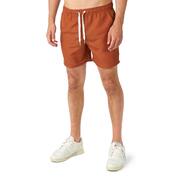The shorts are made from brown fabric and designed in a boardshorts style with side pockets, elastic waist and drawstring ties for adjustable sizing.