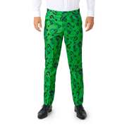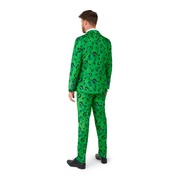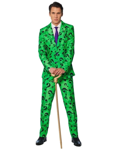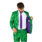 The jacket and pants are made from a bright green polyester fabric covered in the Riddler's classic black and dark green question marks design.