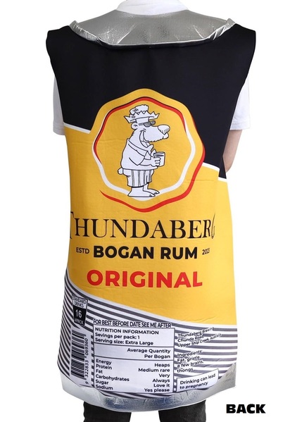 The double-sided foam tunic is printed to resemble a can of classic Aussie rum - only this one is super bogan.