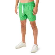 The shorts are made from green fabric and designed in a boardshorts style with side pockets, elastic waist and drawstring ties for adjustable sizing.