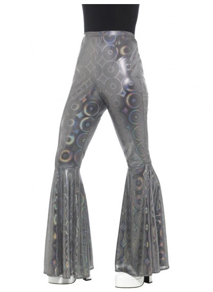 Adult woman flared silver trousers, perfect for a 70's disco party! Medium - large size (approx. women's UK size 12-18.)