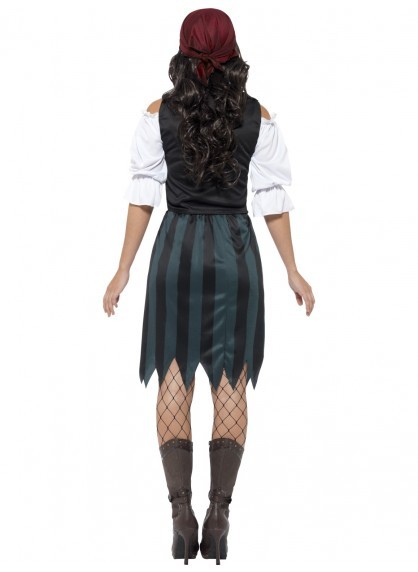 This adult woman pirate deckhand costume is perfect for heaps of different occasions! This costume includes the shirt, mock waistcoat, skirt, belt and bandana. Costume is a size large (designed to fit a women's UK size of approx. 16-18 - see chart for approximate sizing.)