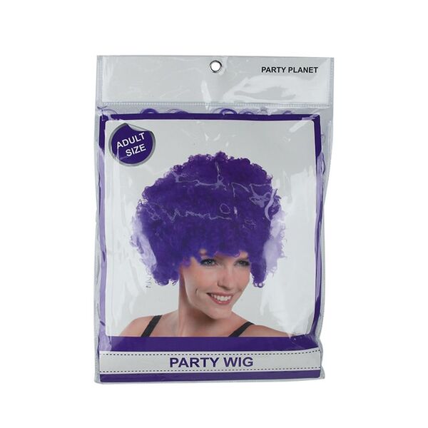 The curly purple synthetic hair can be styled to your liking right up to a full round afro style - perfect for clowning around or dancing the night away.