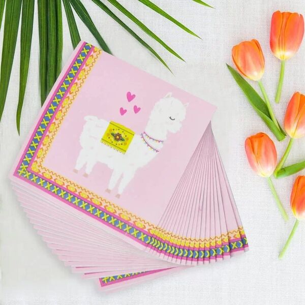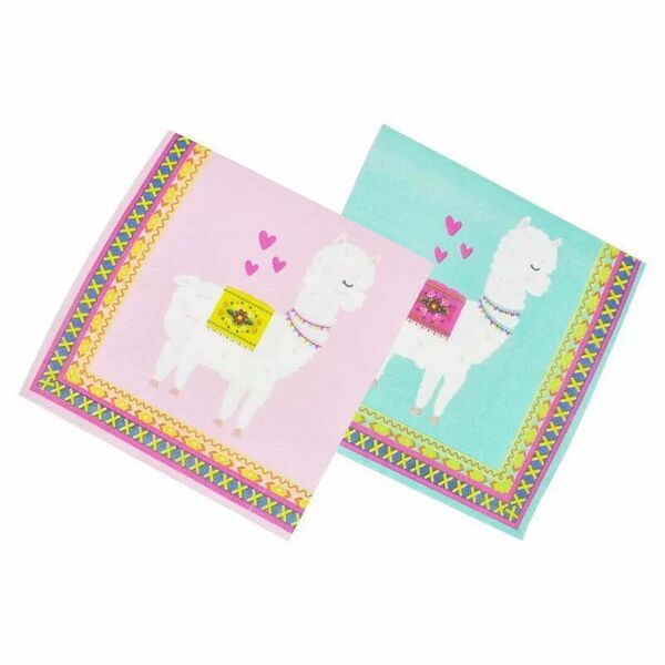 Your guests are sure to love the sweet design of these napkins featuring cute llamas and hearts on pink & green background with a colourful border print.