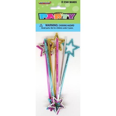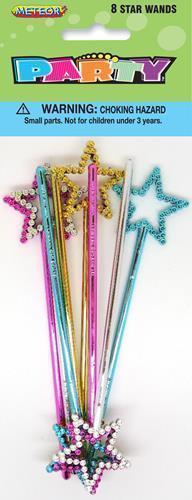Pack of 8 assorted colour star wand party favours, each measuring approx. 17cm in length.