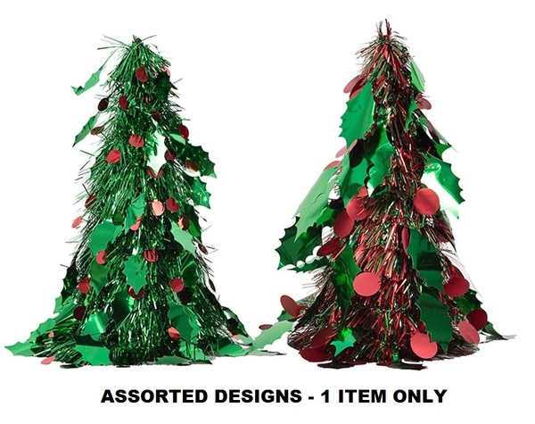 The cone-shaped plastic frame is wrapped securely in tinsel and measures approx. 25cm (h) x 12cm (w).