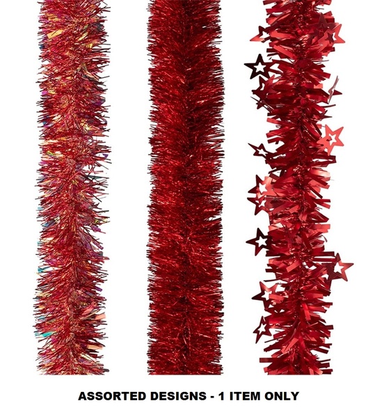 This pack contains 1 x 2m length of red foil tinsel in assorted designs - iridescent, fluffy, stars.