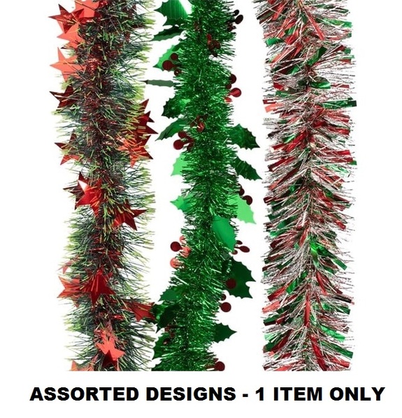 This pack contains 1 x 2m length of red & green foil tinsel in assorted designs - holly, fluffy, stars.