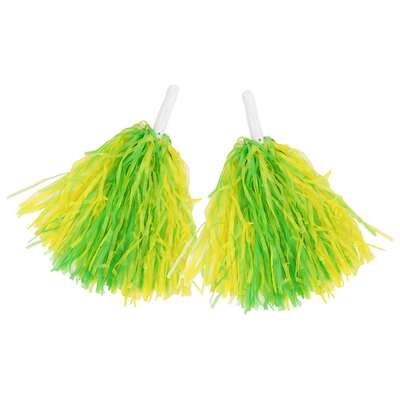 The pom poms are made from strands of colourful yellow & green plastic attached to white easy-grip handles and measure approx. 30cm in total length.