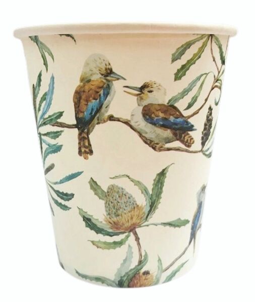 Complete your Aussie party setup with this 10 pack of Australia Day paper cups, featuring a charming kookaburra and banksia foliage design.