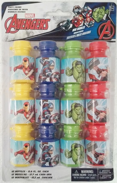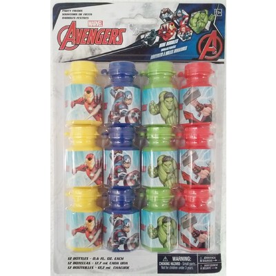 Pack of 12 Avengers themed mini bubble bottles, each measuring approx. 5cm in total height and with approx. 17ml of bubble liquid in each.