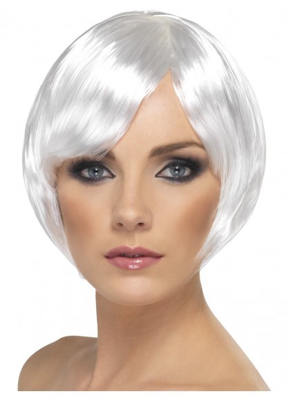Babe short white bob wig with a sweeping side fringe, designed to fit most adults.