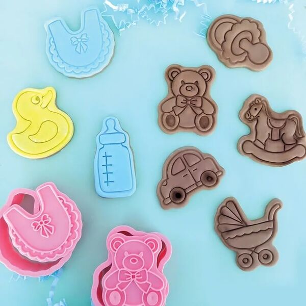 This fabulous set in cludes 8 baby themed cutters and 8 matching stampers/embossers - designs include a fun assortment of baby items - rocking horse, pram, pacifier, teddy bear, rubber duck, bottle, bib & toy car.