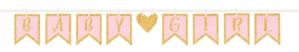 Baby girl pink pennant banner with gold glitter and white pegs, perfect for any baby shower celebration! Measures approx. 3.65m in total length (each cardboard cutout to go on the banner measures approx. 12cm x 15cm.) White ribbon is included in the pack (some assembly required, as cutouts need to be pegged on to ribbon the create the banner.)