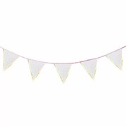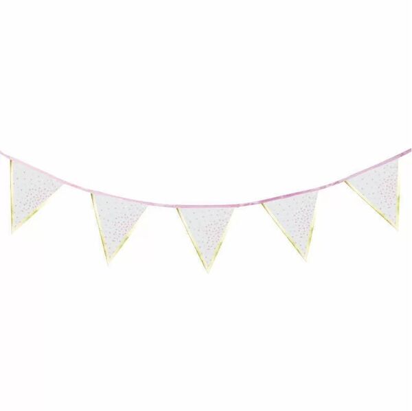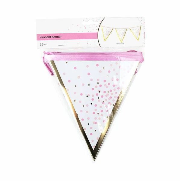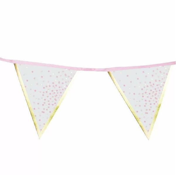 It is made from durable cardstock triangles, printed with pink & metallic gold dots and an eye-catching gold border, attached to a pink fabric ribbon.