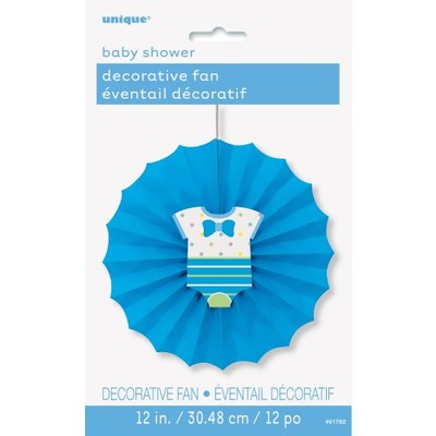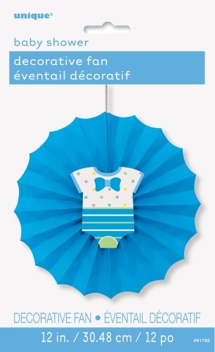 Baby shower boy blue decorative fan, measures approx. 30cm in diameter when assembled.