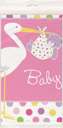 Baby shower themed plastic tablecover, measures approx. 1.37m x 2.13m.