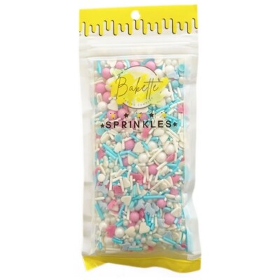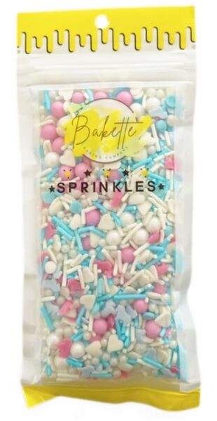 This pack includes pink and white sugar pearls, blue confetti and jimmies, white hearts and jimmies, blue and pink horses - largest pieces measure approx. 7mm.