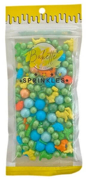 This pack includes blue, green, orange and yellow dinosaurs, blue, green orange sugar pearls, green jimmies, yellow nonpareils - largest pieces measure approx. 10mm.
