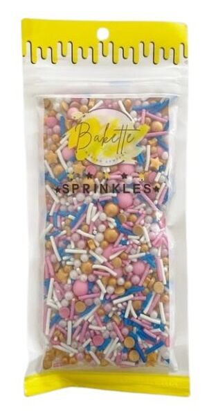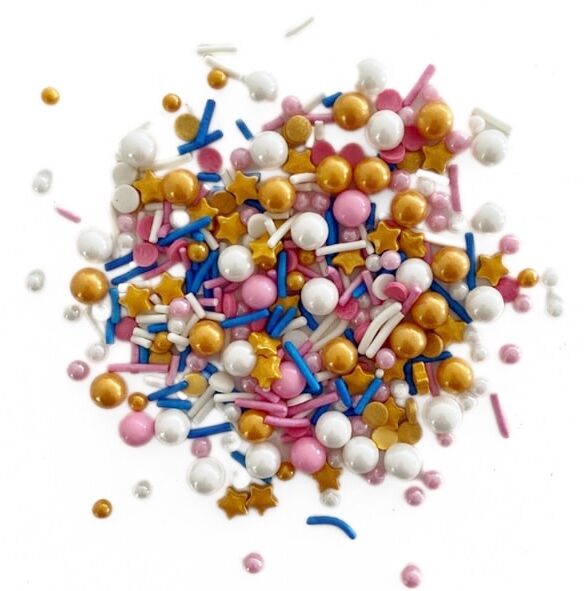 This mix includes gold, pink and white sugar pearls, gold and pink confetti, gold stars, and blue, pink and white jimmies.