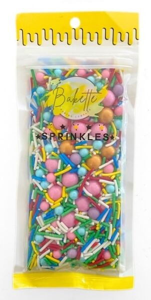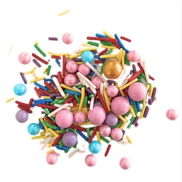 This colourful mix includes gold, blue, pink and purple sugar pearls and rainbow jimmies.