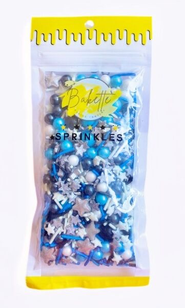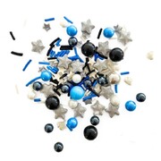 This meteoric mix includes silver and white stars, silver, blue and black sugar pearls, blue, black and white jimmies.