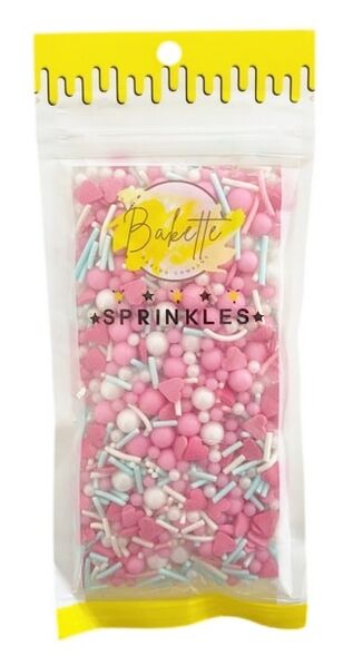 This lovely mix includes pink and white sugar pearls, pink hearts, blue, pink and white jimmies.