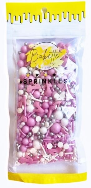 This funky mix includes pink stilettos, pink, silver & white sugar pearls, pink & white jimmies, white confetti & nonpareils.