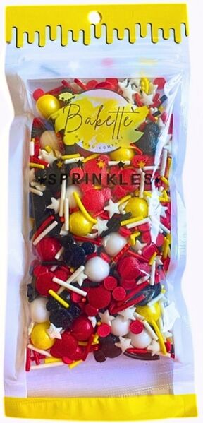 This pack includes red, yellow, black and white sugar pearls and jimmies, red confetti, white stars - largest pieces measure approx. 10mm.