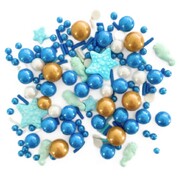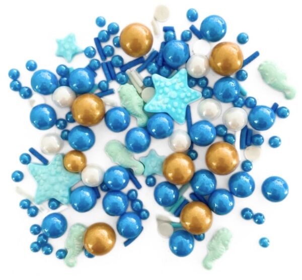 This pack includes light blue starfish, aqua seahorses, blue, gold and white sugar pearls, white confetti, blue and white jimmies - largest pieces measure approx. 14mm.