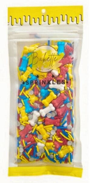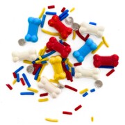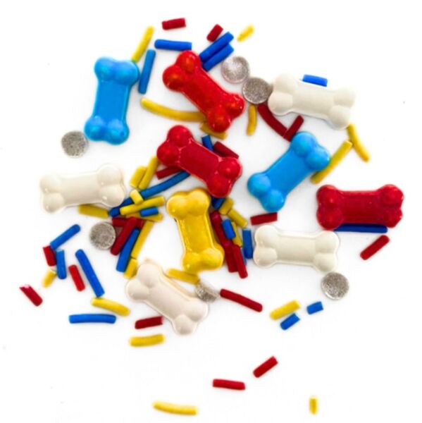 This pack includes blue, red, yellow and white bones, blue, red and yellow jimmies, silver confetti - largest pieces measure approx. 15mm.