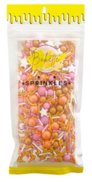This pack includes peach, pink, gold sugar pearls, peach, pink, gold, white jimmies, white stars and confetti - largest pieces measure approx. 10mm.