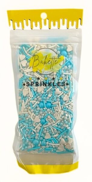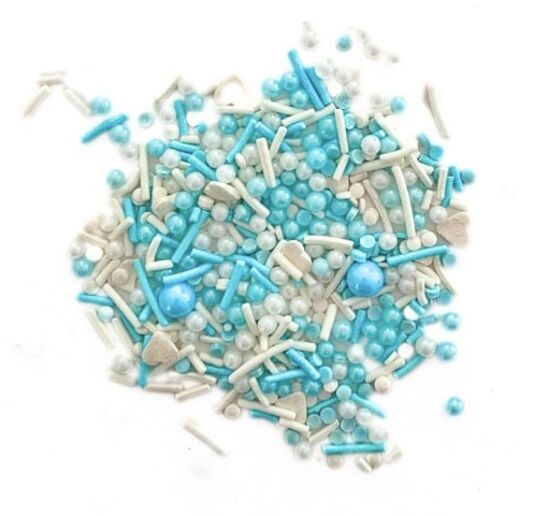 This enchanting mix includes blue and white sugar pearls, confetti, jimmies, and white hearts.