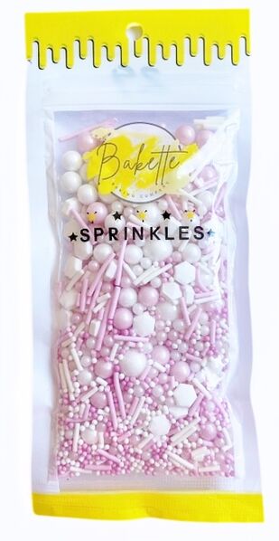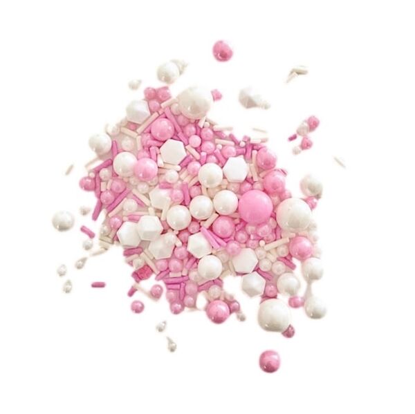 This enchanting mix includes pink and white sugar pearls and jimmies, white diamonds and white nonpareils.
