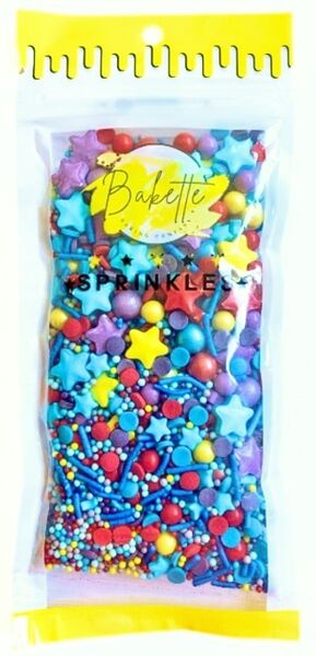 This pack includes blue, red, yellow and purple sugar pearls, jimmies, confetti, stars and nonpareils - largest pieces measure approx. 11mm.