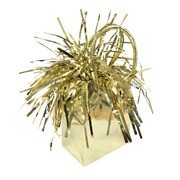 Gift bag shaped gold foil balloon weight, used for the anchoring of balloons when used in table decorations.