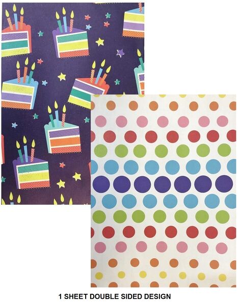 Featuring cake slice & spotted designs, this double-sided gift wrap is ideal for birthdays and special occasions.