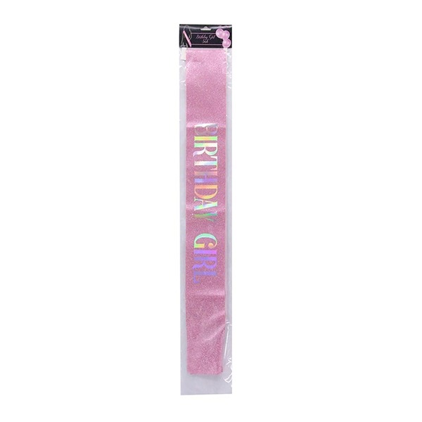This sash measures approx. 9.5cm wide and 135cm long and is made from 100% polyester pink glitter fabric with iridescent silver 'Birthday Girl' sticker decal.