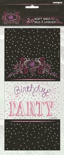 Birthday party sweets cello gift bags, each measuring approx. 29cm x 13cm. 20 in a pack. Silver twist ties included.