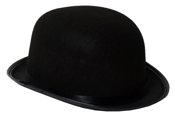 Black bowler hat, perfect for heaps of different costume parties! Designed to fit most adults. Hat has a piece of black satin ribbon tied around the outside bottom edge (just above the brim.) Made of hard, felt-like material.