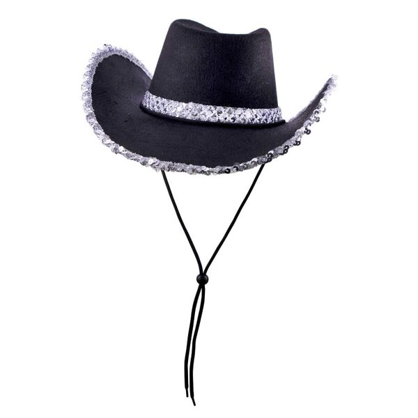 This hat is made from black moulded felt and features silver sequin trim around the brim & crown and a black nylon chin strap with toggle.