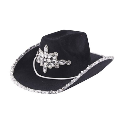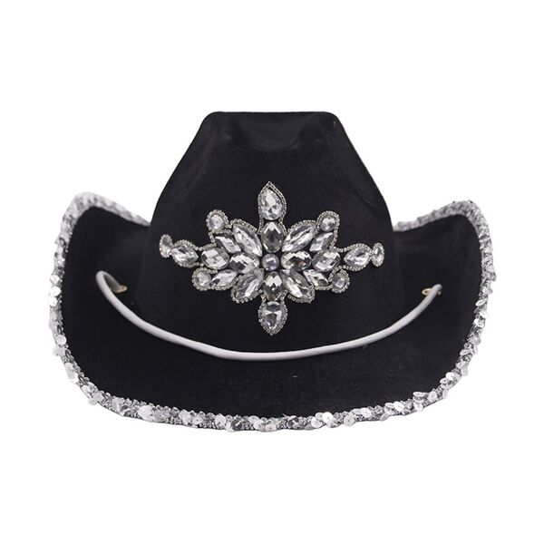 This hat is made from black faux suede fabric and features silver sequin trim around the brim and a rhinestone & diamante decal on the front of the crown.