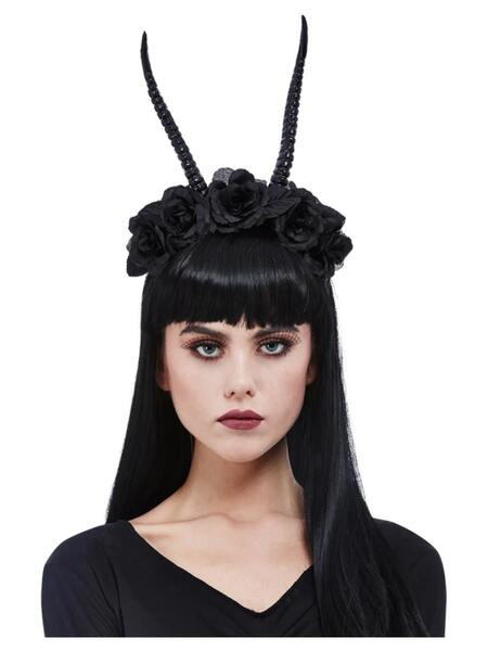With its tall thin horns and row of black fabric roses, it can be easily adapted to different looks.