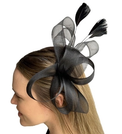 This hairpiece is made from durable plastic mesh shaped in to a loops & bow design with three small feather embellishments fixed onto a felt base. A silver hair clip is securely attached to the back.