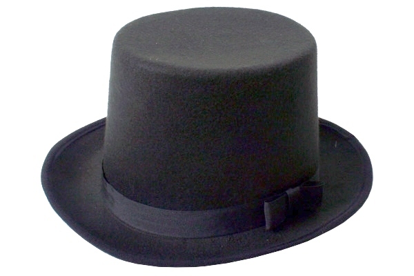 Black felt Lincoln-style top hat, perfect for heaps of different costume parties! Designed to fit most adults. Hat has a piece of black ribbon tied around the outside bottom edge (just above the brim.)