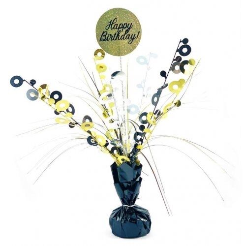 Featuring a black wrapped base and silver, gold & black strands this eye-catching centrepiece will make a stunning addition to your birthday celebration.