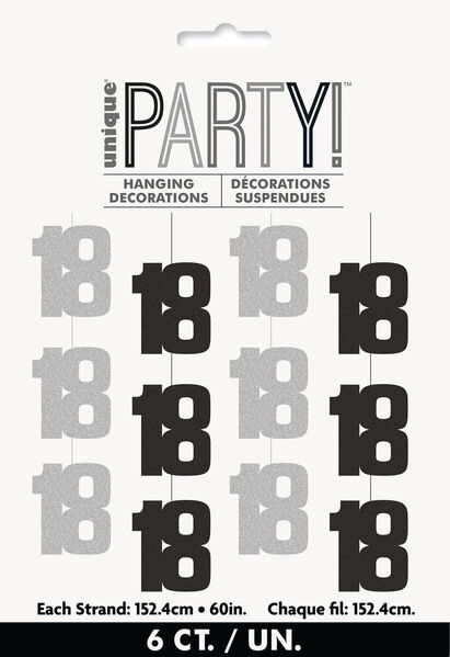 Each pack contains 6 decorations consisting of prismatic foil '18' cutouts on a 152cm string - 3 black & 3 silver.