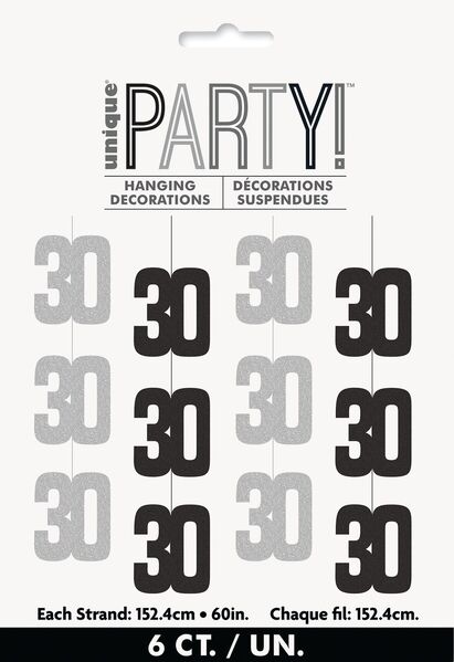 Each pack contains 6 decorations consisting of prismatic foil '30' cutouts on a 152cm string - 3 black & 3 silver.