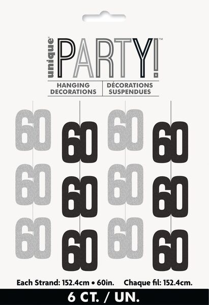 Each pack contains 6 decorations consisting of prismatic foil '60' cutouts on a 152cm string - 3 black & 3 silver.