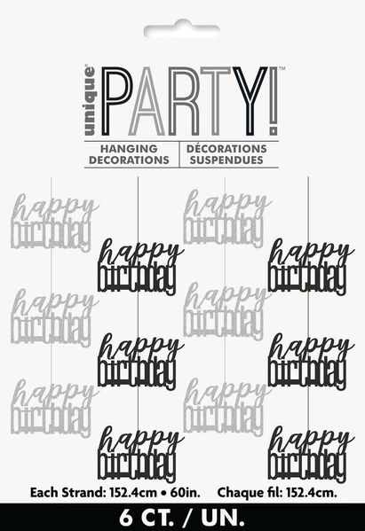 Each pack contains 6 decorations consisting of prismatic foil 'Happy Birthday' cutouts on a 152cm string - 3 black & 3 silver.